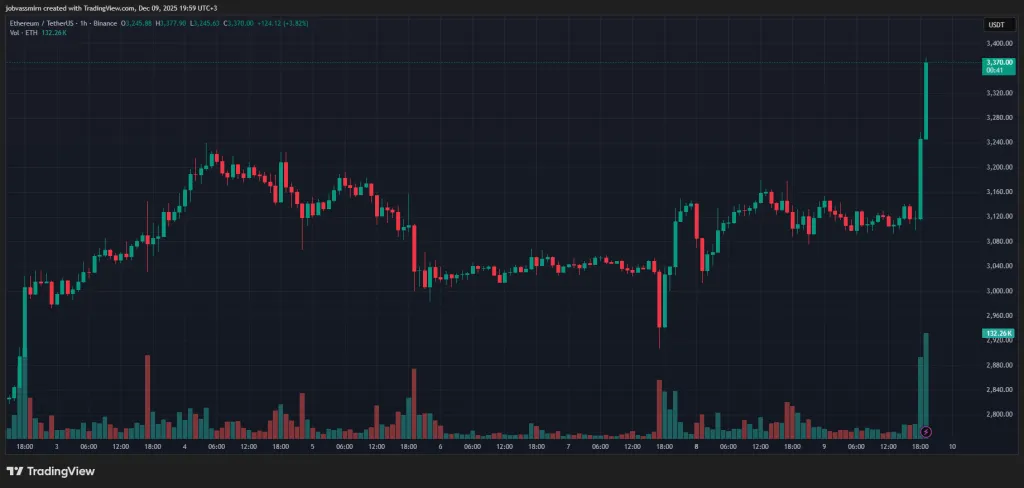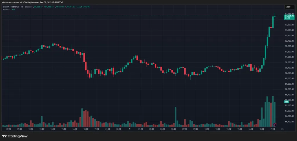 9 декабря после открытия торговой сессии в США биткоин резко подскочил с $90 000 до $94 000.