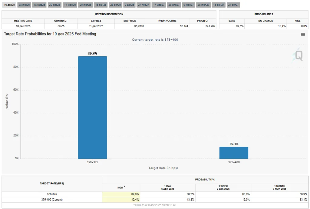 Участники рынка оценивают вероятность снижения ключевой ставки на 25 б. п. в 89,6%.