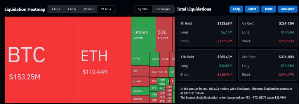 За прошедшие сутки объем ликвидаций на рынке достиг $376 млн, из которых на короткие позиции пришлось $296 млн.