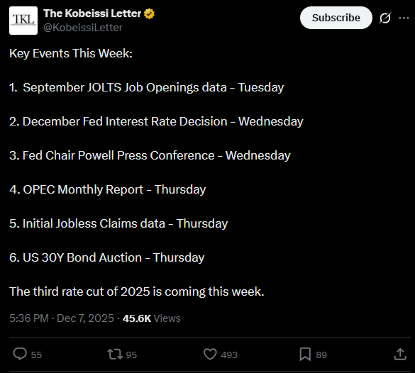 Ликвидность растёт, поскольку количественное ужесточение закончилось, а ФРС продолжает выкуп долгов, что вводит деньги в систему. Исторически такие периоды ликвидности в сочетании с снижением ставок приводили к резкому росту биткоина и других рискованных активов.