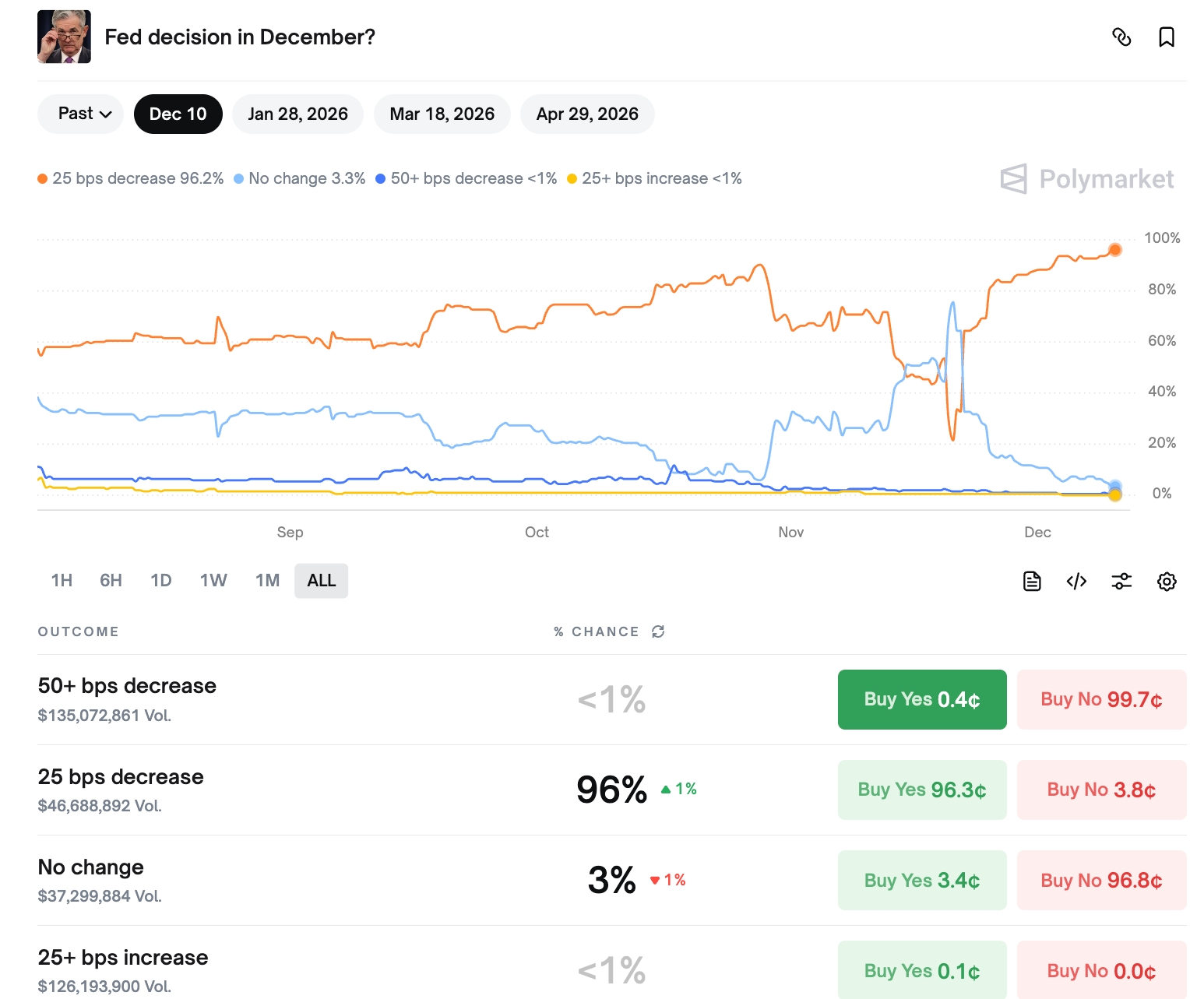Данные платформы Polymarket показывают 96,8% вероятность снижения ставки до диапазона 3,5-3,75%. Вероятность сохранения ставок на прежнем уровне оценивается в 3%.