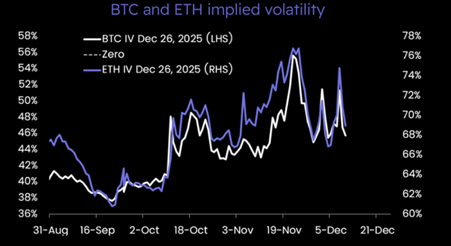 «Без новых поступлений в биржевые фонды (ETF), которые могли бы поддержать направленный импульс, рынок может вернуться к диапазонной торговле. Фактически, эта корректировка уже происходит: подразумеваемая волатильность уменьшается, а рынок постепенно ослабляет шансы неожиданного роста в декабре», — подчеркнули специалисты.