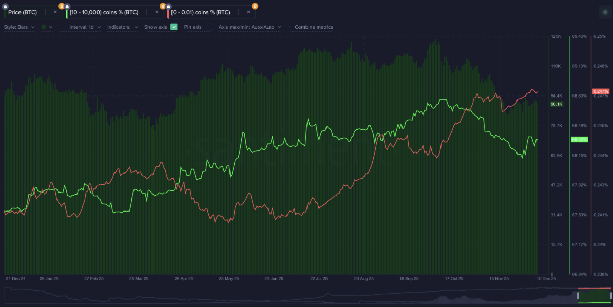 Умные деньги уже начали движение: по данным Santiment, кошельки с балансом от 10 до 10 000 BTC накопили 42 565 биткоинов с 30 ноября.