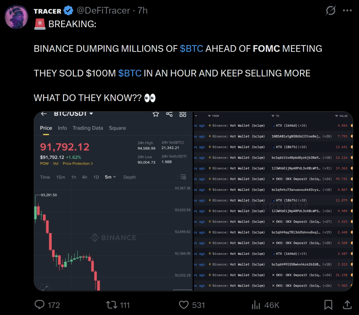 Однако традиционная паника не заставила себя ждать: трейдер DeFiTracer обнаружил продажу биткоинов на $100 млн одним китом в течение часа, что вызвало волну беспокойства.