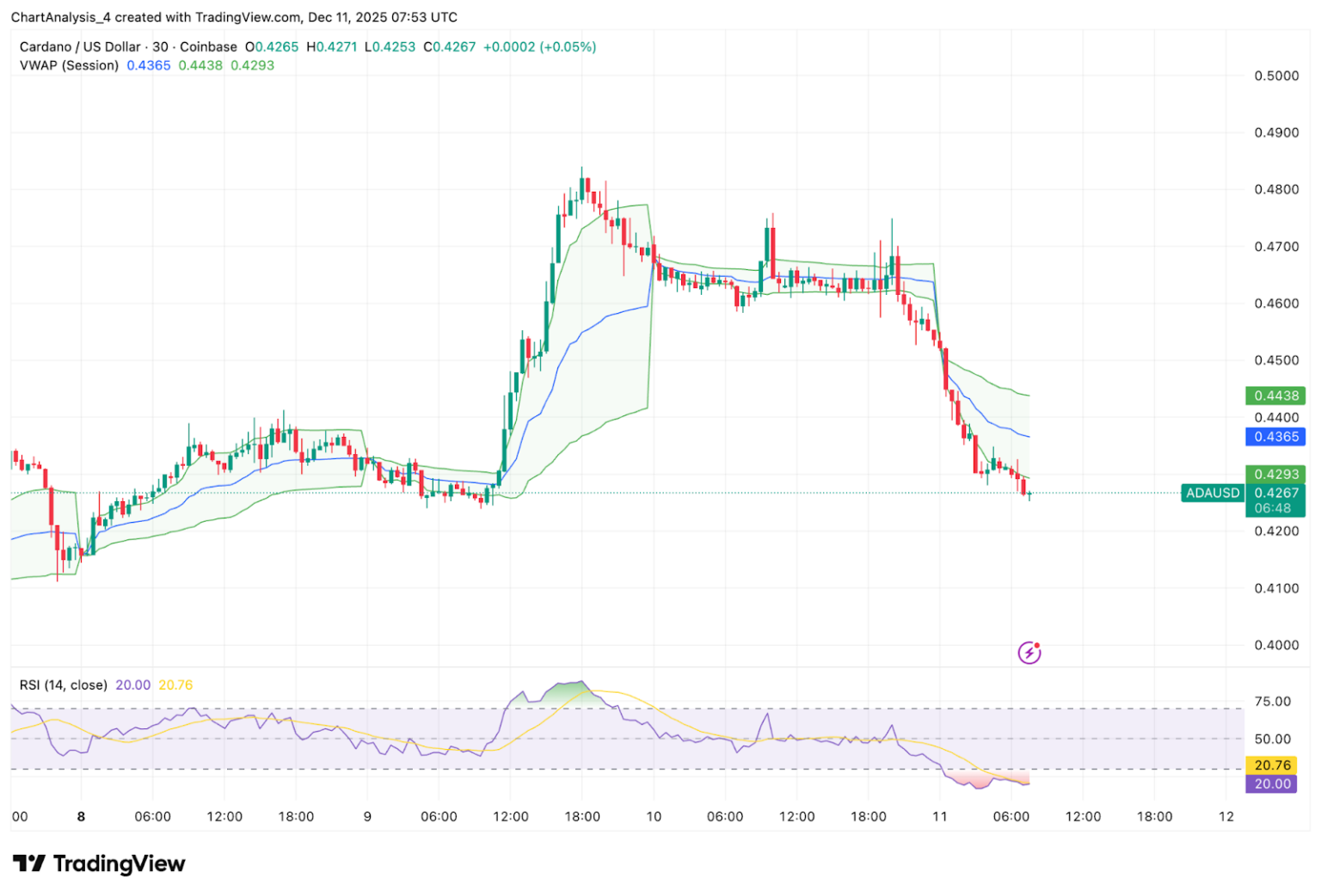 Цена Cardano сегодня торгуется около $0.426 после падения ниже краткосрочной линии тренда, которая поддерживала восстановление с начала декабря. Этот шаг происходит на фоне повторного роста оттока спотовых акций и снижения открытого интереса по фьючерсам более чем на 11 процентов, что сигнализирует о давлении на покупателей, поскольку ADA испытывает трудности с удержанием выше 20 и 50 EMA на четырёхчасовом графике.
