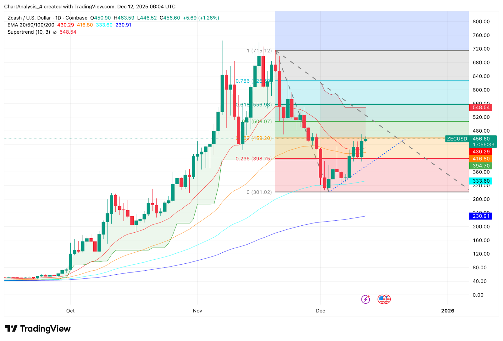 Дневной график показывает, как ZEC приближается к уровню Фибоначчи 0.382 на уровне $459.20, который сейчас пытается вернуть. Следующие основные препятствия: