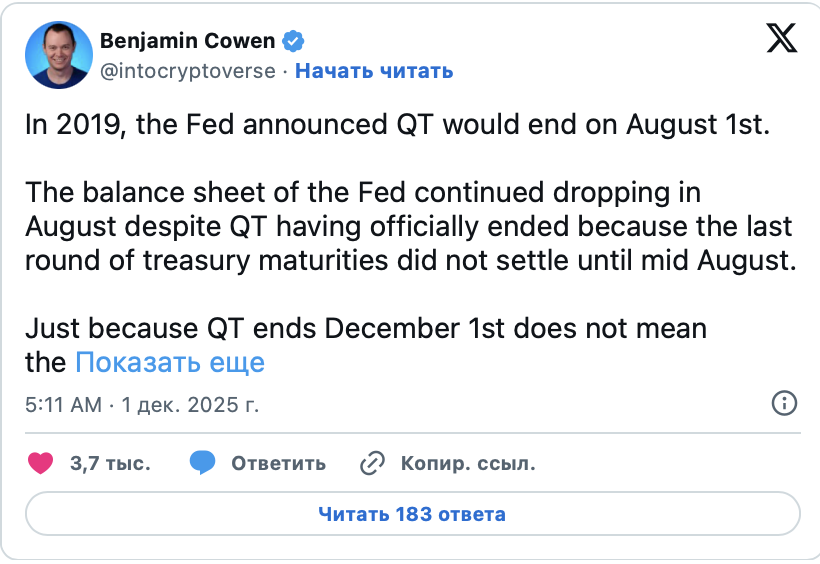 Аналитик Бенджамин Кауэн отметил, что рынки начнут ощущать полноценное влияние завершения QT со стороны ФРС именно в начале 2026 года.