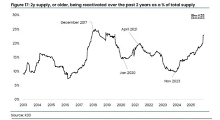 «В отличие от предыдущих циклов реактивации обусловлены […] глубокой ликвидностью американских ETF и спросом со стороны казначейств. Это позволяет OG-китам реализовать прибыль по шестизначным ценам и существенно снизить концентрацию владения», — указали в K33.