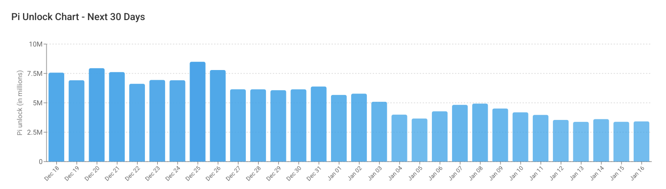 Ежедневные разблокировки в среднем около 5,53 миллиона пи, что составляет примерно $1,13 миллиона. Примечательно, что крупнейшее разблокировка выходит 25 декабря, выпуская около 8,49 миллиона пи. Трейдеры часто внимательно следят за такими событиями, поскольку дополнительное циркулирующее предложение может оказывать давление на цену во время слабых трендов.