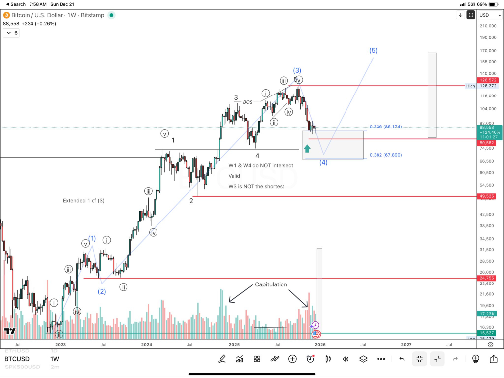 Трейдинговый аккаунт Korinek_Trades ожидает обновления исторического максимума, однако допускает, что перед этим произойдет новое значительное падение. «Согласно волновому анализу Эллиотта, биткоин должен обновить исторический максимум в рамках пятой волны, чтобы завершить полную структуру», — объясняет он свой прогноз. «Цель роста — $150 000».