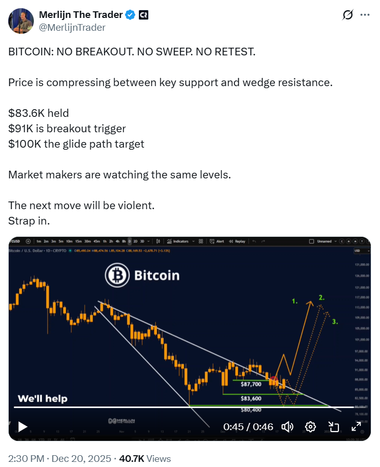 На четырёхчасовом графике Dogecoin остаётся зафиксированным внутри нисходящего канала, который определяет движение цены с начала декабря. Каждая попытка восстановления застопорилась под верхней границей канала, усиливая схему более низких максимумов. Недавний отскок от минимума $0.120 не имел продолжения, что говорит о том, что продавцы всё ещё активны на ралли.