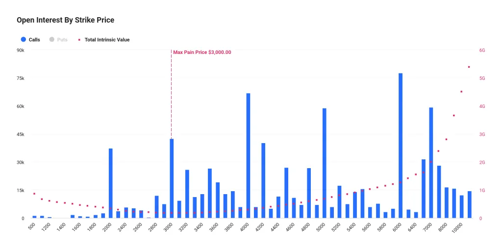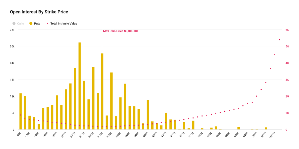 Менее 15% таких ставок на рост сделаны на более реалистичном уровне — $3000 или ниже. Здесь также находится точка «максимальной боли».