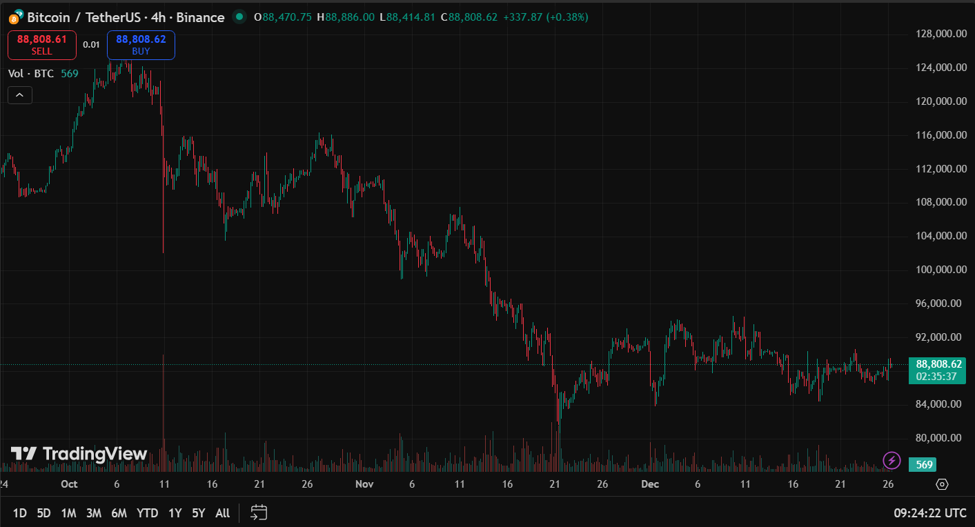 По данным TradingView, на момент написания цифровое золото торгуется по $88 811. Это почти на 30% ниже исторического максимума в $126 080, зафиксированного в начале октября.