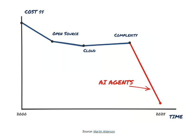 Эксперты отмечают, что внедрение агентного программирования сократило внутренние затраты на разработку ПО примерно на 90%. Это делает классическую дилемму — «строить или покупать» — бессмысленной, поскольку такая низкая цена в создании и настройке ИИ-инструмента убивает всю конкуренцию.