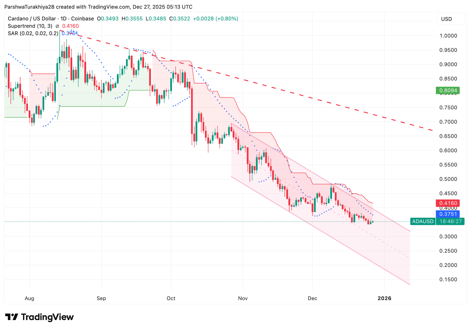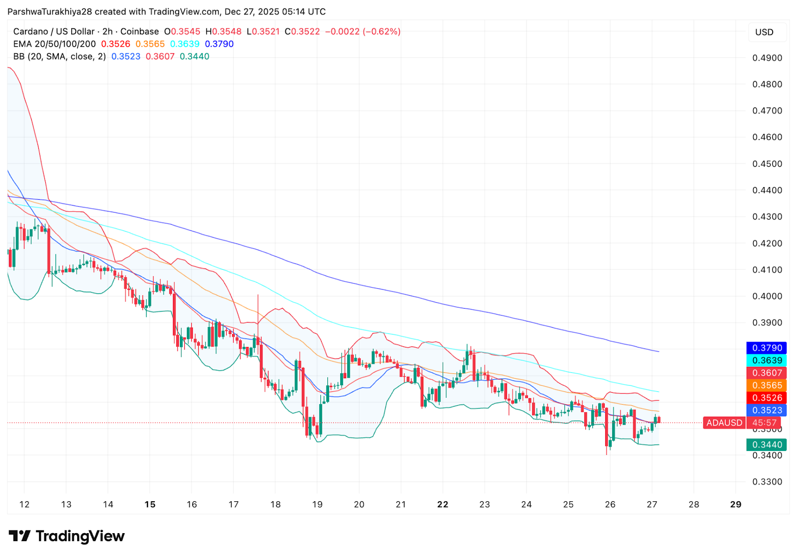 - ADA удерживает базу $0.34–$0.35, но нисходящий канал по-прежнему контролирует направление тренда.