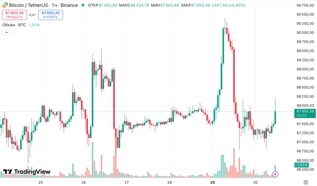 На момент написания цена биткоина составляет ~$87 800. За последние сутки цена актива снизилась на 1,8%.