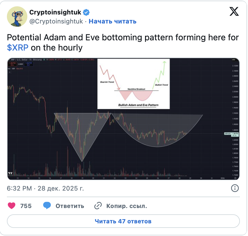 Ряд наблюдателей рынка сохраняет позитивный настрой относительно перспектив монеты. Один из аналитиков указал на формирование паттерна «Адам и Ева» на часовом графике XRP.