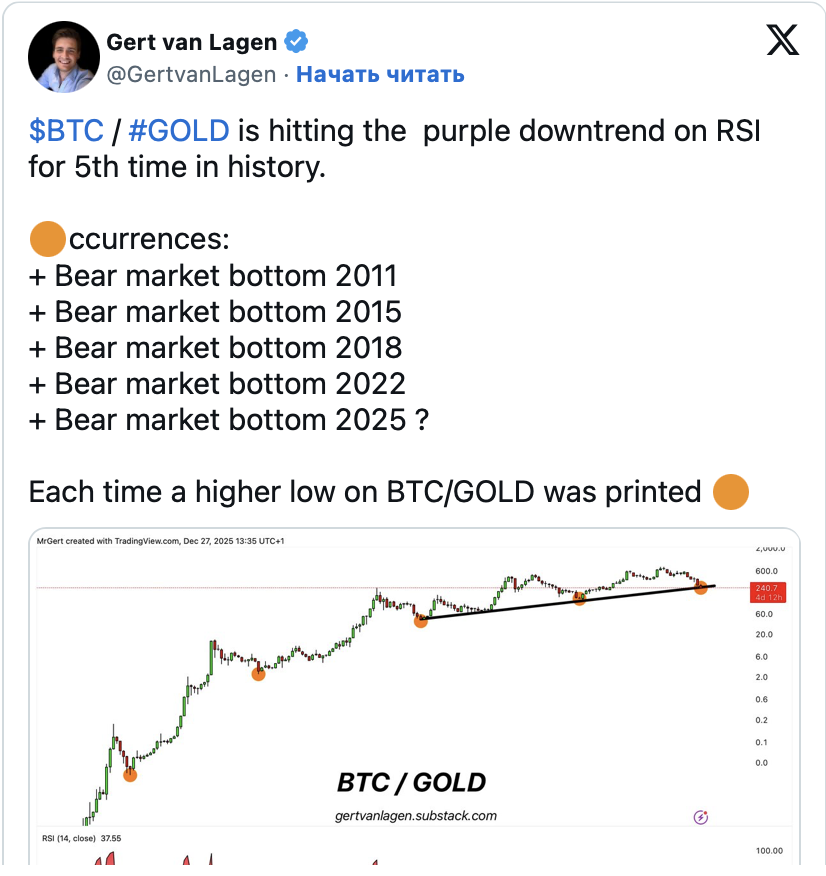 С технической точки зрения соотношение BTC/GOLD также подает ключевой сигнал. Макростратег Герт ван Лаген выделил важную деталь. Индекс относительной силы (RSI) этого соотношения в пятый раз в истории коснулся ключевой нисходящей линии.