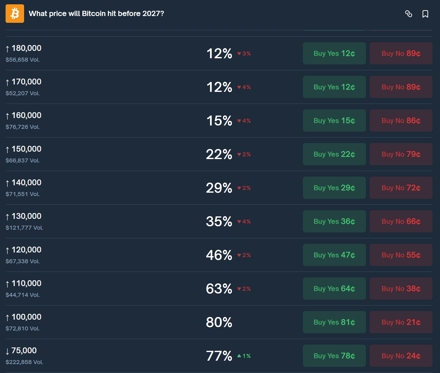 Трейдеры на платформе прогнозов Polymarket оценивают вероятность того, что биткоин достигнет отметки $160 000 в 2026 году, в 15%. При этом более умеренные цели выглядят для рынка заметно реалистичнее.