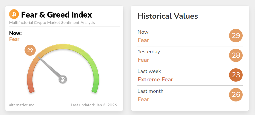Индекс страха и жадности, измеряющий общие настроения на крипторынке, 3 января показал значение «страх» в 29 баллов. Показатель находится в диапазоне от «страха» до «экстремального страха» с начала ноября 2025 года.