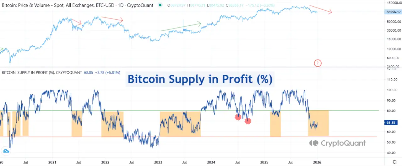 Доля предложения биткоина (Supply in Profit), которая в настоящее время находится в прибыли, составляет 68,85%. Показатель остаётся в пределах так называемой переходной зоны — от 55% до 80%, что может указывать на завершение фазы роста и постепенный переход к медвежьему рынку. Об этом заявили аналитики CryptoQuant.