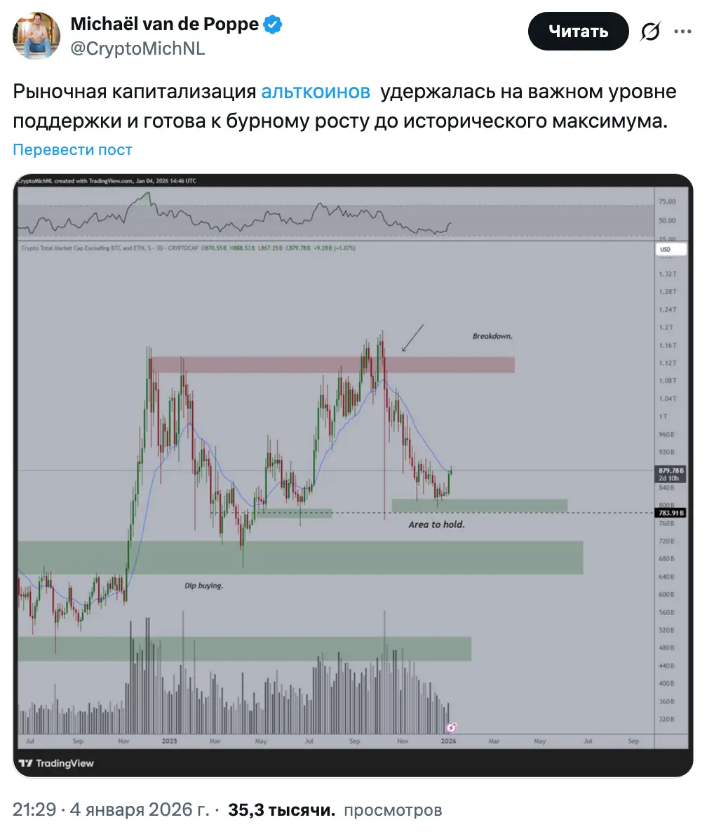 По оценке криптотрейдера и рыночного аналитика Михаэла ван де Поппе, рынок альткоинов, чья капитализация на момент публикации превышает $879 млрд, готов к новому серьезному подъему — вплоть до предыдущего исторического максимума в почти $1,2 трлн.