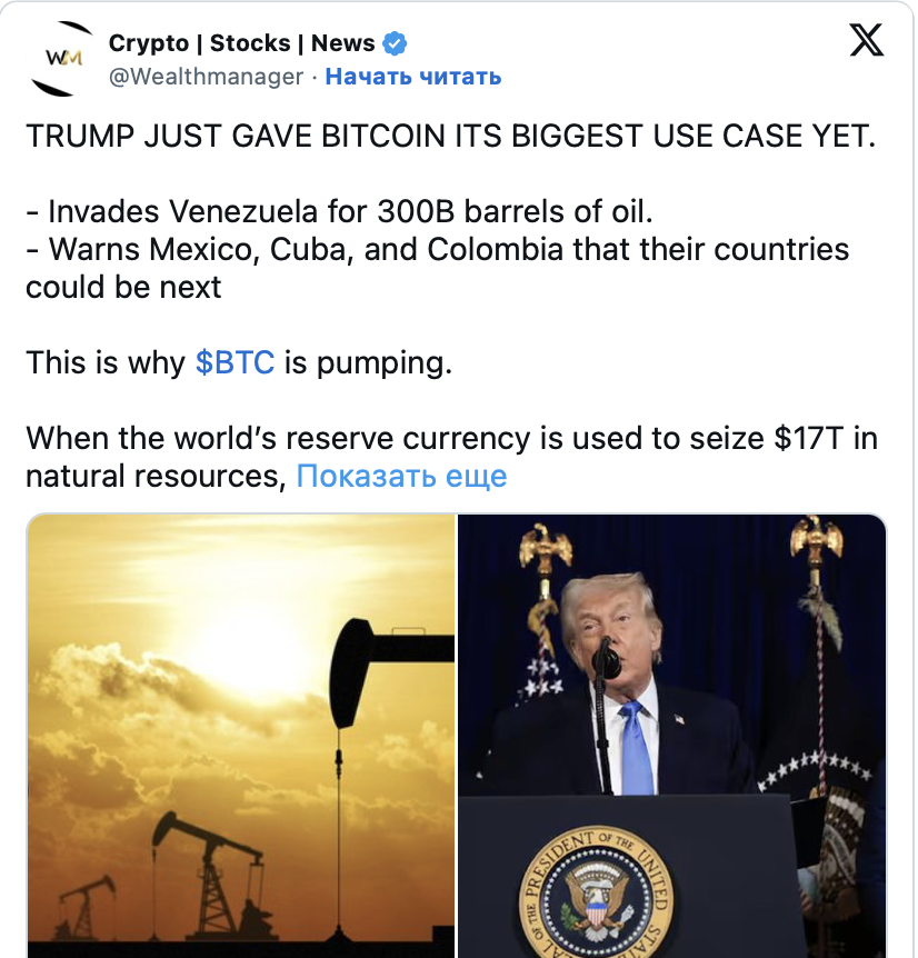 Помимо влияния цен на нефть, существует еще один фактор. Ранее сообщалось о предполагаемых государственных запасах биткоина в Венесуэле. Если эти активы перейдут под контроль США и будут заморожены, это может создать долгосрочный дефицит предложения, что благоприятно скажется на стоимости первой криптовалюты.