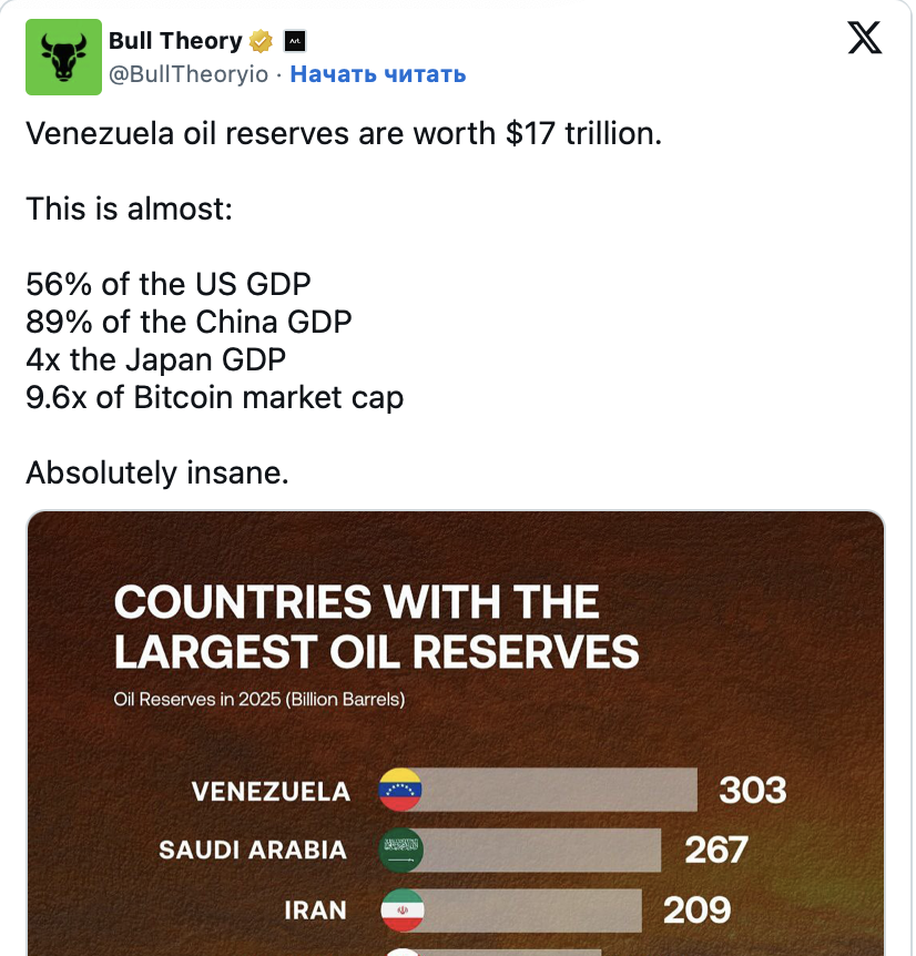 Аналитики The Kobeissi Letter подчеркивают, что переход контроля над Венесуэлой к США приведет к увеличению предложения на рынке. Инвесторы понимают, что события выходных в конечном итоге устранят перебои в поставках, а не усугубят их. Рынок закладывает в цену сценарий эффективного управления ресурсами.