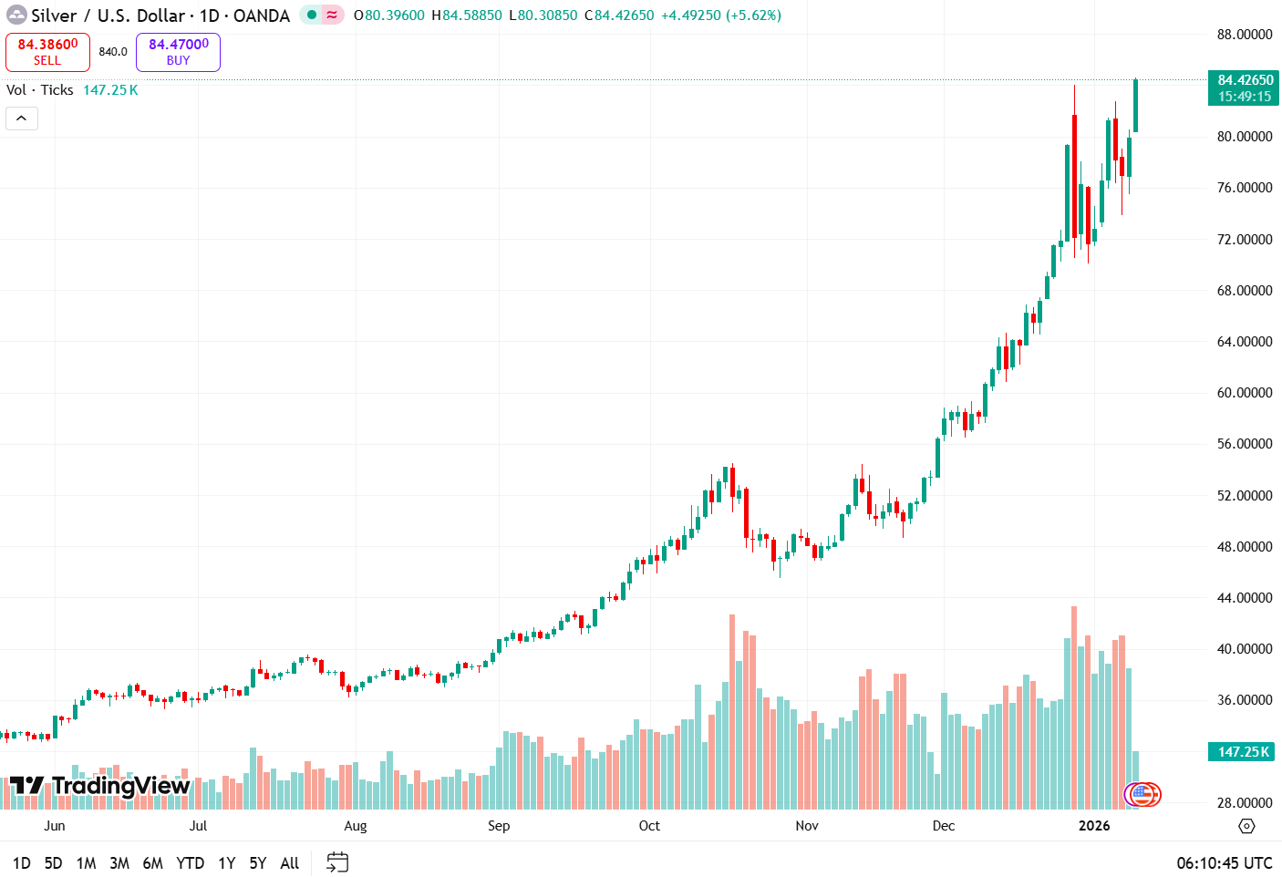 В начале понедельника цены на драгоценные металлы выросли, так как инвесторы искали активы-убежища на фоне растущей геополитической напряжённости. По данным TradingView, спотовая цена на золото достигла нового максимума в районе 4600 долларов, а цена на серебро превысила 84 доллара.