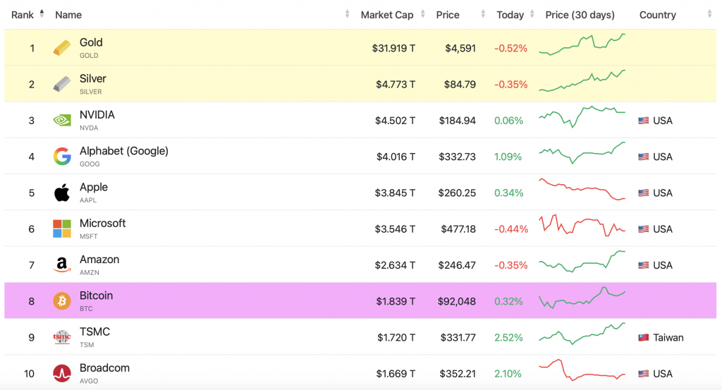 Серебро совершило стремительный рывок в рейтинге мировых активов по рыночной капитализации, поднявшись с шестого места на второе. Если в октябре 2025 года его капитализация составляла $2,999 трлн при цене $53,29 за унцию, то по данным CompaniesMarketCap на 13 января металл достиг $4,776 трлн при стоимости $84,84 за унцию. Золото по-прежнему удерживает лидирующие позиции с капитализацией $31,917 трлн при цене $4 590 за унцию, но серебро теперь опережает технологических гигантов NVIDIA ($4,502 трлн) и Alphabet ($4,016 трлн).