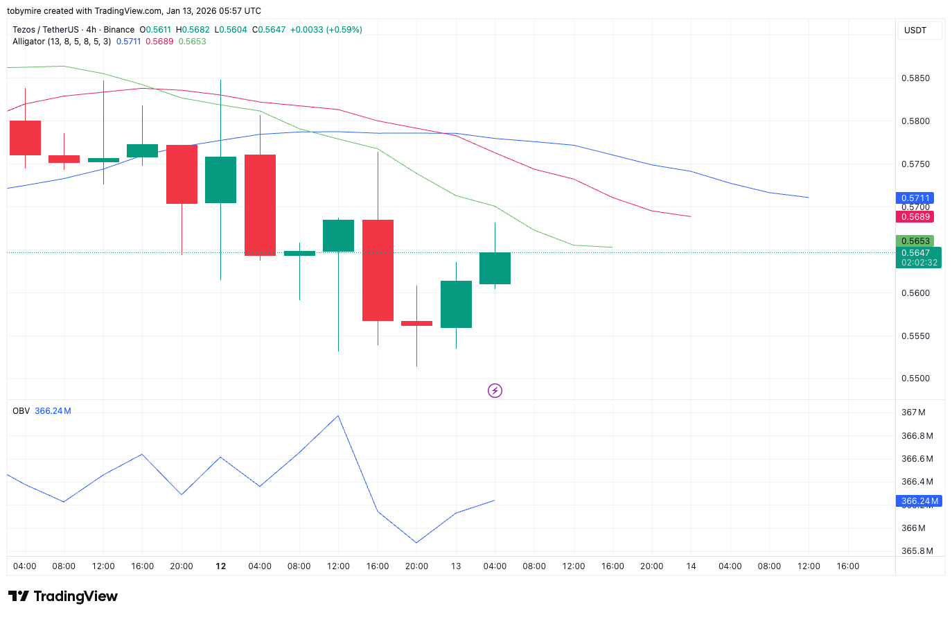 Shiba Inu вошёл в фазу охлаждения после резкого импульсного роста в начале этого месяца. Ценовое движение сместилось в сторону консолидации, поскольку импульс замедлился ниже недавнего максимума колебания. Несмотря на эту паузу, более широкая структура остаётся конструктивной в рамках четырёхчасового срока. Трейдеры продолжают отслеживать, является ли этот откат сигналом о продолжении тренда или к более глубокой коррекции.