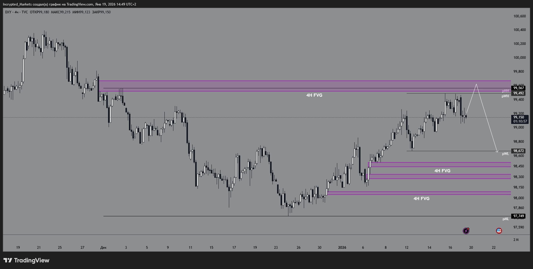 Если зона 99,49–99,57 не даст закрепа, логичный ход — откат к pWL 98,67, дальше смотрим реакцию: удержали → можно пилить/стабилизироваться, потеряли → открывается дорога в нижние 4H FVG.