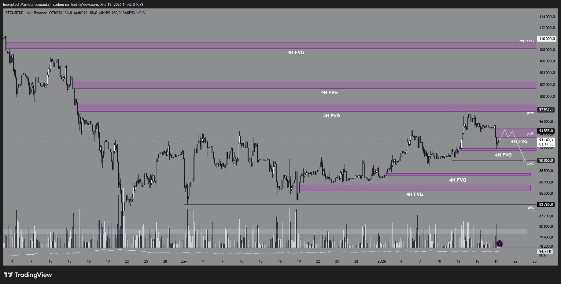 Логика тут заключается в том, что рынок дозаполняет верхний FVG/полку, после чего отдает коррекцию в сторону минимумов прошлой недели или ниже — к следующей ликвидности.