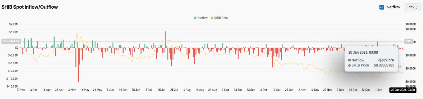 Спот-флоу добавили осторожного прогноза. Кроме того, чистые потоки остались в основном отрицательными, при этом оттоки доминируют в последние сессии. Последний показатель около -609,7 тысячи долларов 20 января показывает, что продавцы всё ещё контролируют запись. Следовательно, SHIB может потребовать более сильной волны накопления перед развитием устойчивого отскока.