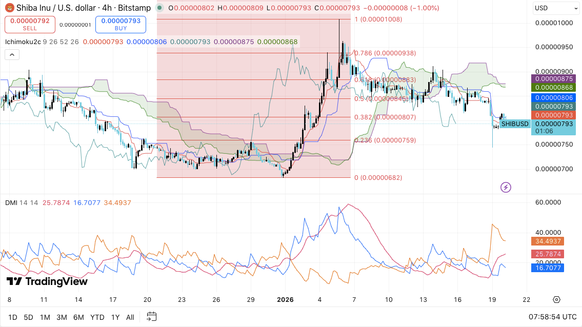 Трейдеры теперь рассматривают облако Итимоку как серьёзный барьер, поскольку оно продолжает блокировать отскоки на 4-часовом графике. Помимо ограничения роста, облако также укрепляет более широкую идею о том, что SHIB остаётся на этапе коррекции.