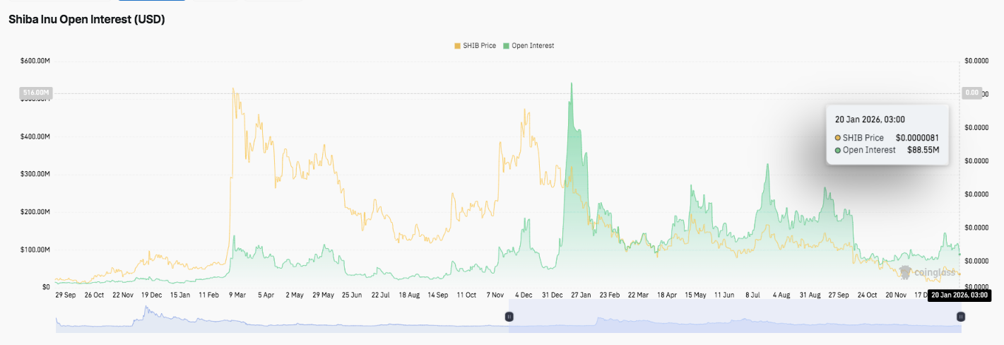 Данные по деривативам также отражают осторожность. Открытый интерес SHIB когда-то взлетел выше 500 миллионов долларов во время пикового спекуляционного цикла. Однако с тех пор кредитное плечо снизилось и сейчас составляет около 88,55 миллиона долларов. Это снижение свидетельствует о снижении риска у трейдеров.