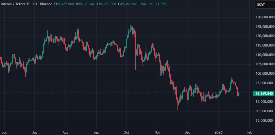 На момент написания биткоин торгуется вблизи отметки $89 000:
