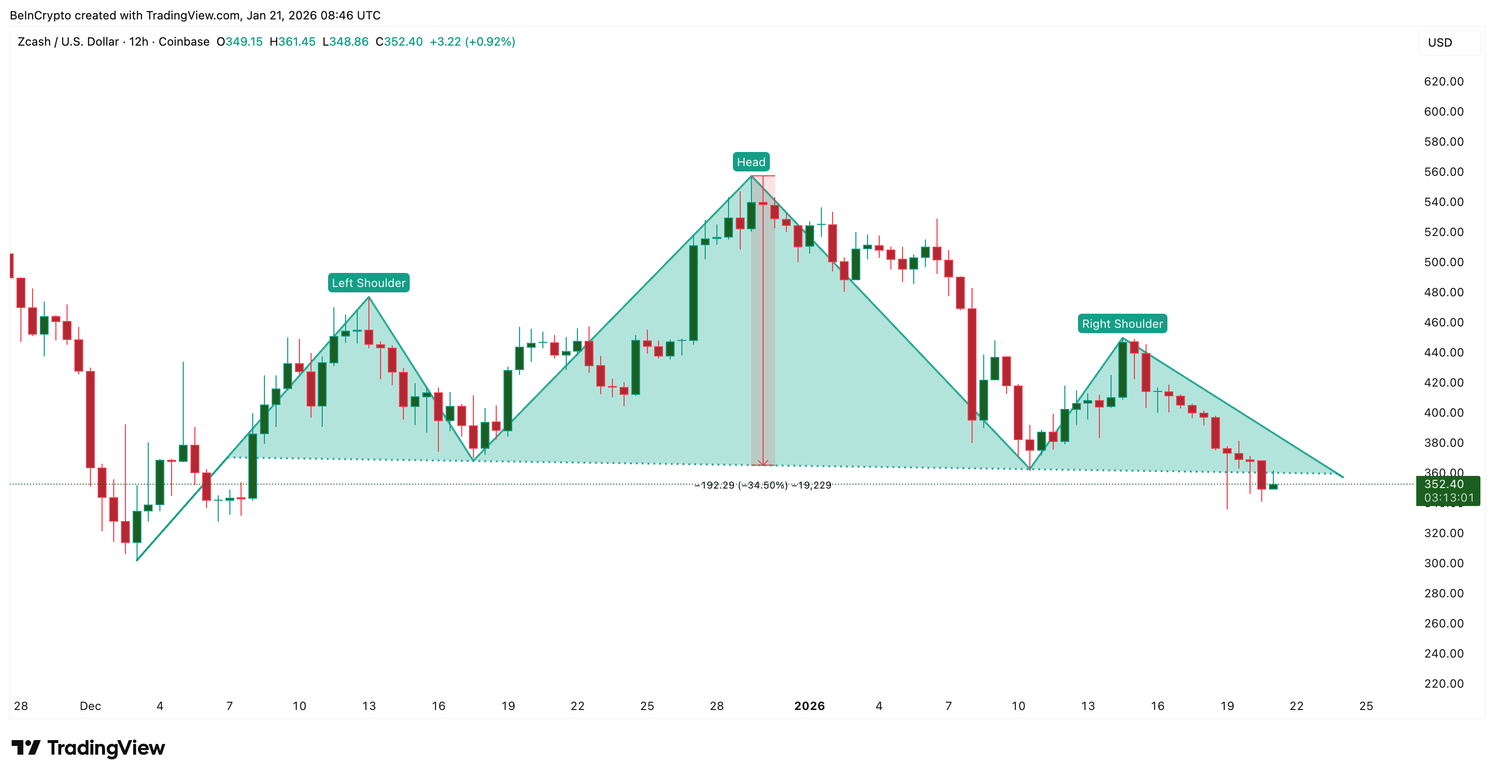На 12-часовом графике 20 января Zcash также подтвердил пробой по фигуре «голова и плечи». Такой разворотный паттерн появляется после движения вверх и обычно сигнализирует о дальнейшем снижении, если цена пробила линию шеи. В данном случае цель по этому сигналу — снижение примерно на 34%, и сейчас этот сценарий остается актуальным.