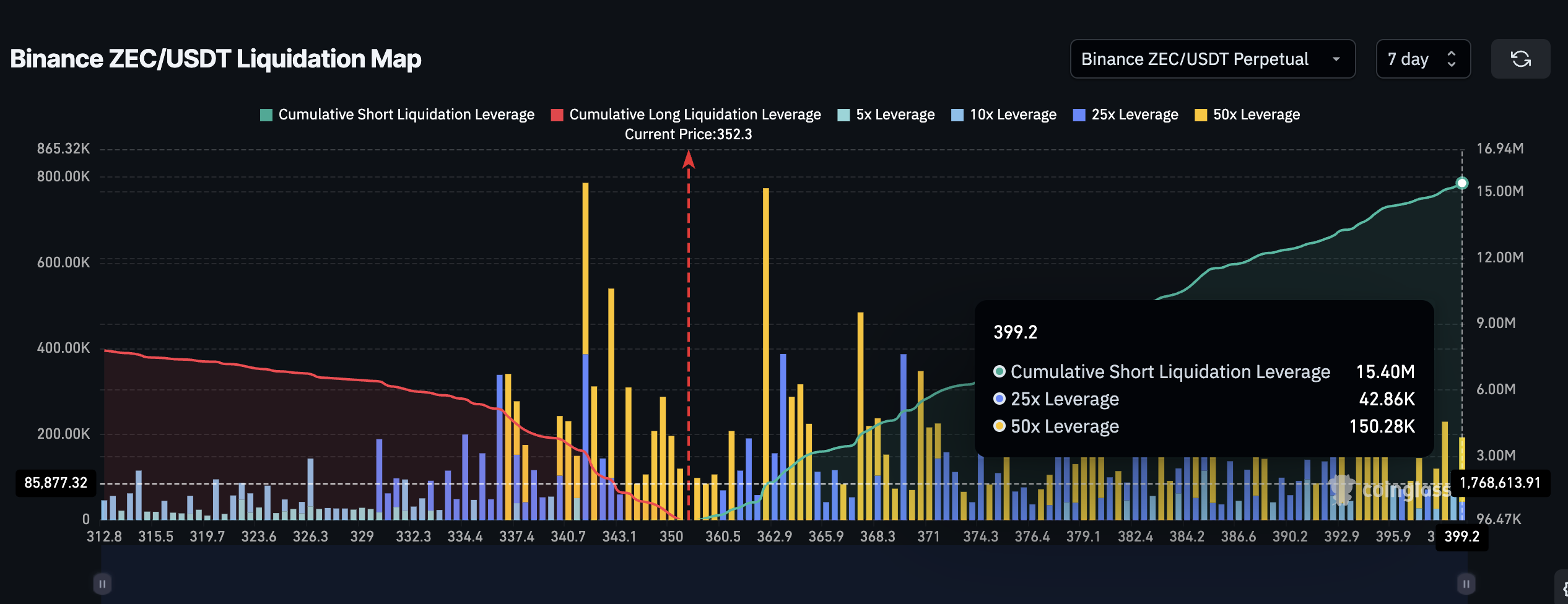 В случае с Zcash суммарный риск ликвидаций по шортам на ближайшие дни — около $15,4 млн, по лонгам — примерно $7,8 млн. Позиции на понижение сейчас существенно преобладают: соотношение почти 2 к 1 в пользу шортов.