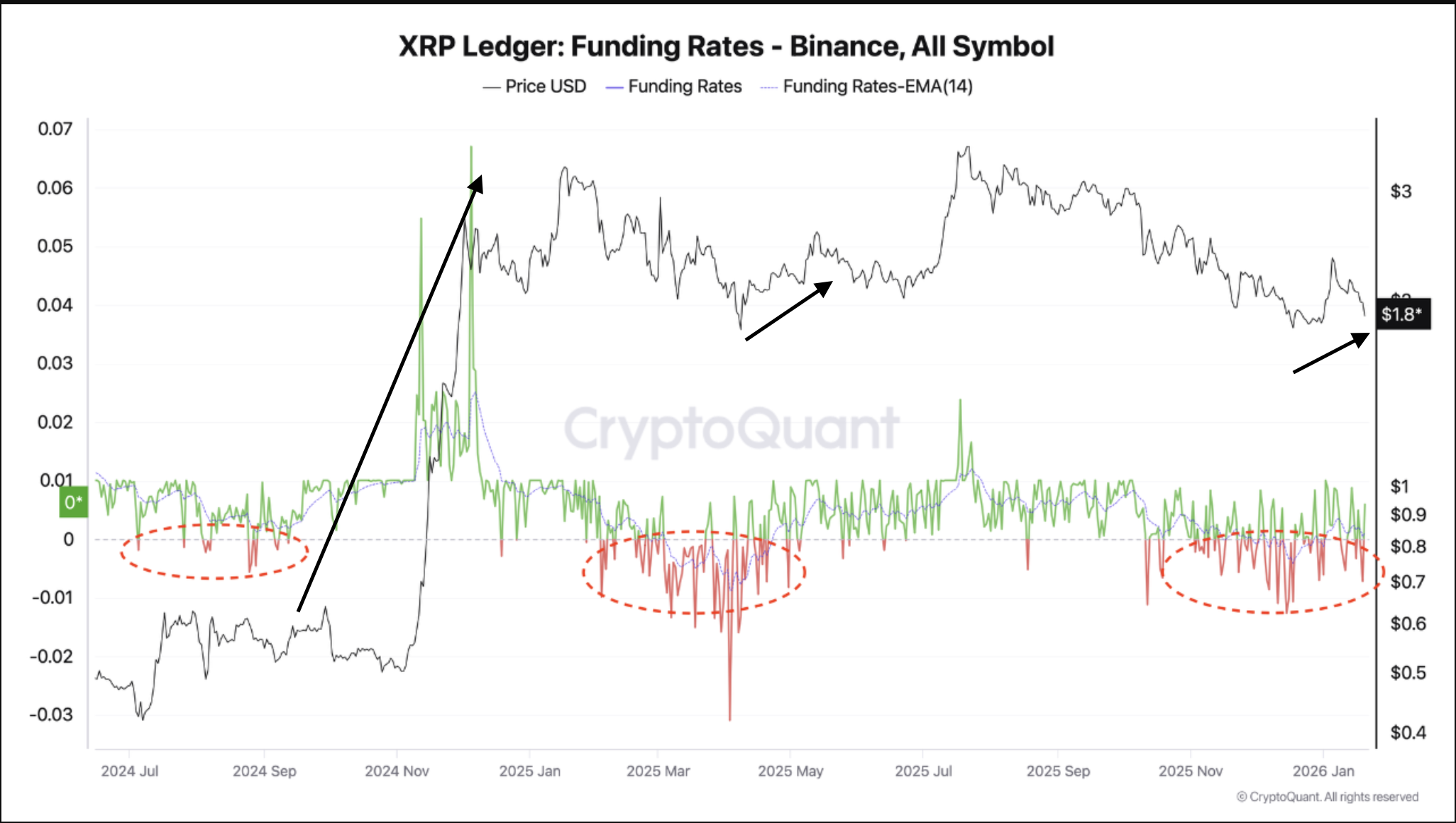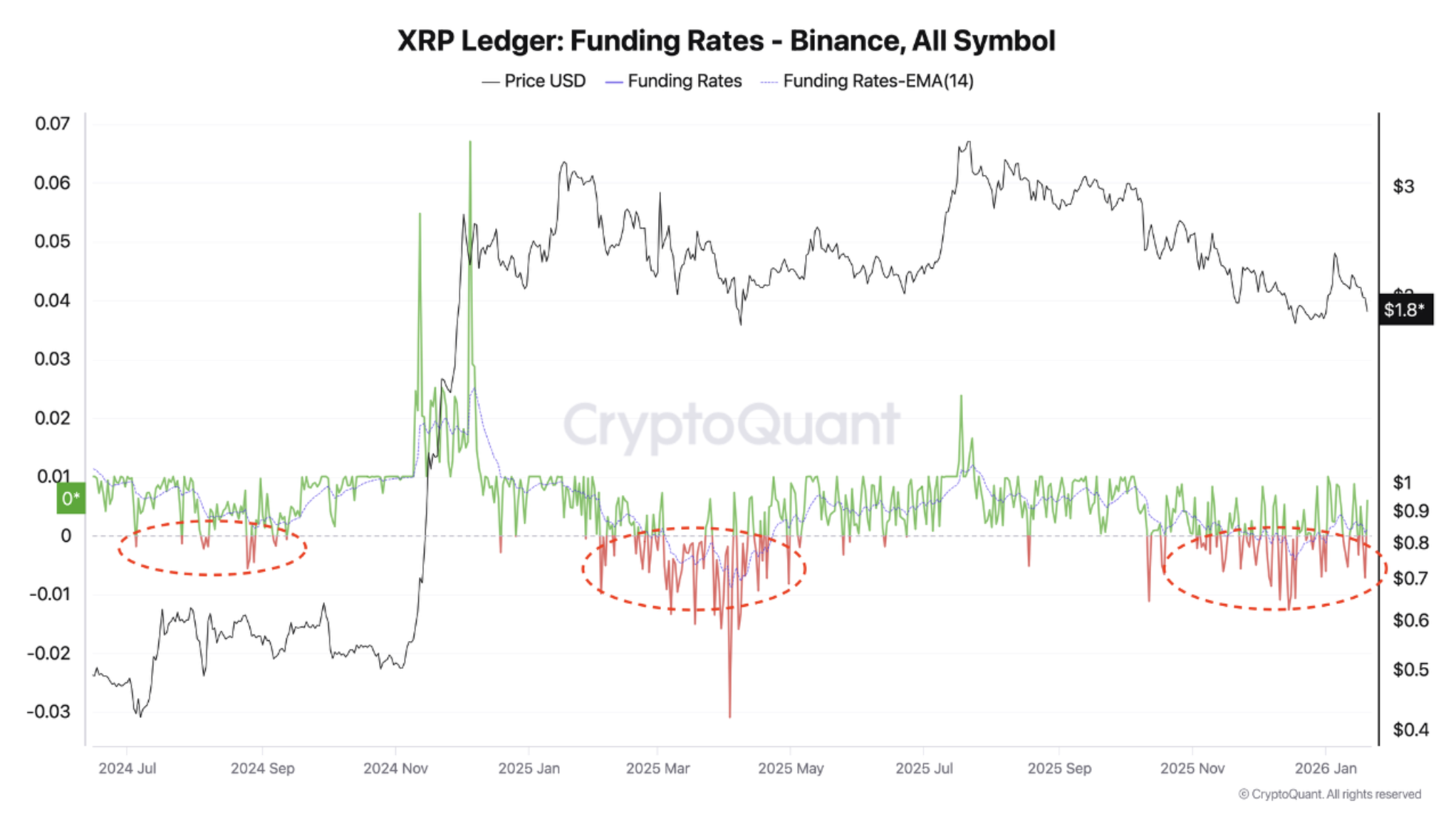 В течение последних двух месяцев ставки финансирования по бессрочным контрактам на XRP (XRP) на Binance оставались преимущественно отрицательными, отражая негативный настрой большинства трейдеров в отношении перспектив монеты.