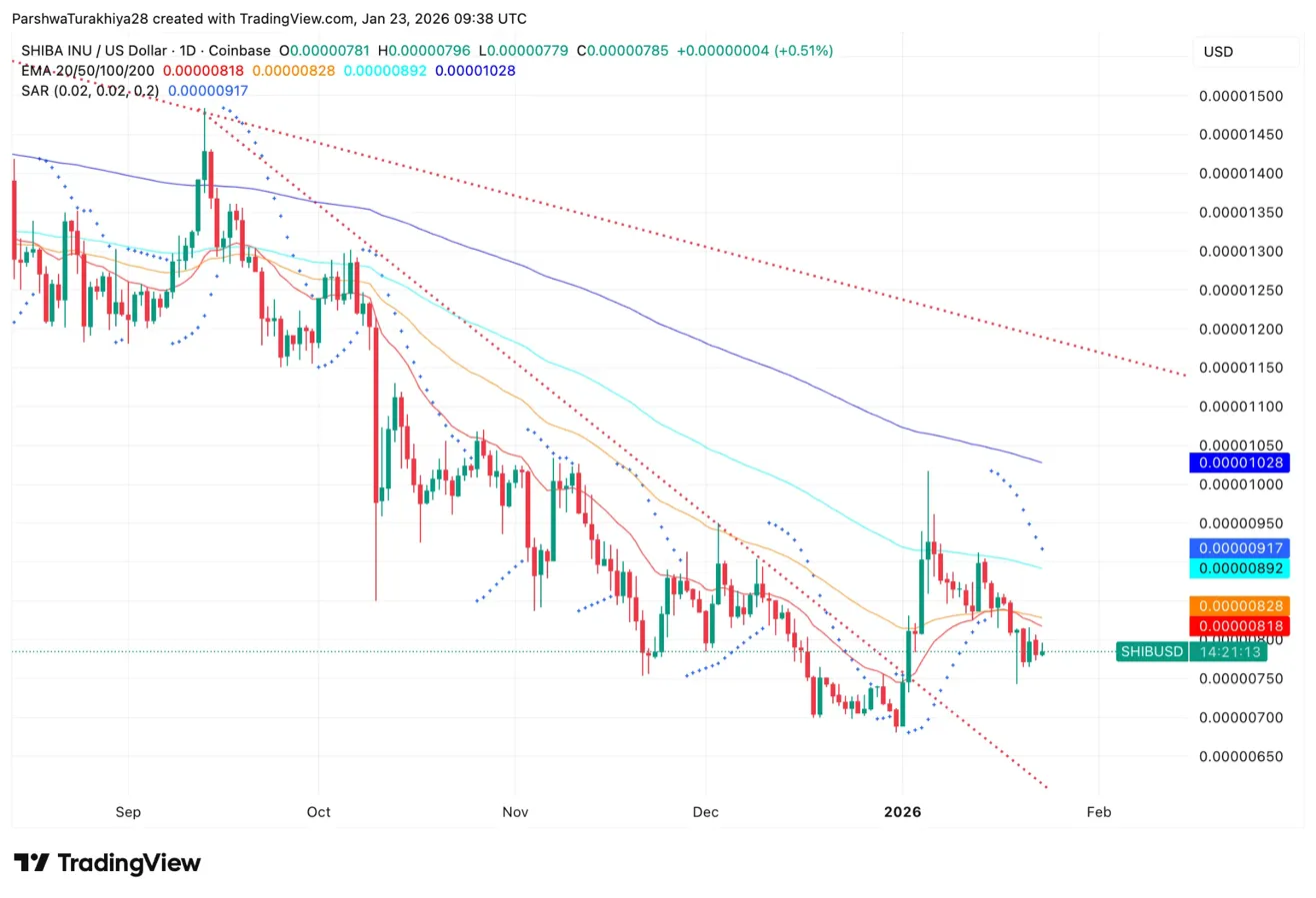 - Shiba Inu торгуется на $0.00000785, консолидируясь ниже 20- и 50-дневных EMA, поскольку трейдеры деривативов возвращаются с возобновлённым интересом.
