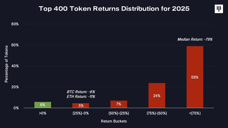 Медиана падения достигла 79% — показатель более 59% представленных на рынке монет превысил 75%, у 24% от совокупного показателя они составили в диапазоне от 50% до 75%. В плюсе завершили год порядка 6% криптовалют.
