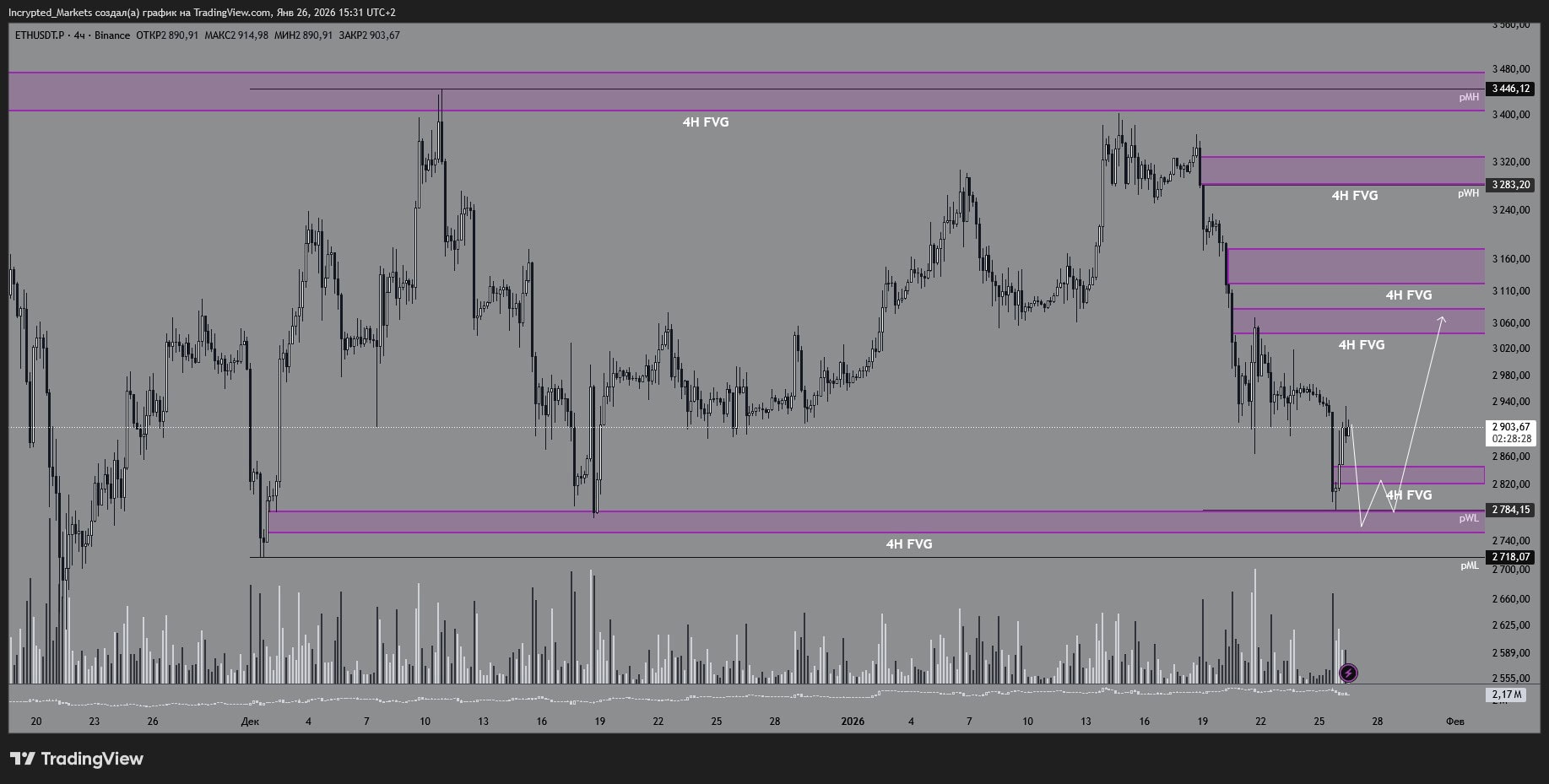 В этом случае все читается через «старшего»: дали коррекцию в зону $2700-$2800 и получили отскок на открытии недели. Пока доминирования нет, поэтому Ethereum воспринимаю как ведомого: сначала структура и реакция по биткоину, затем перенос логики на Ethereum.