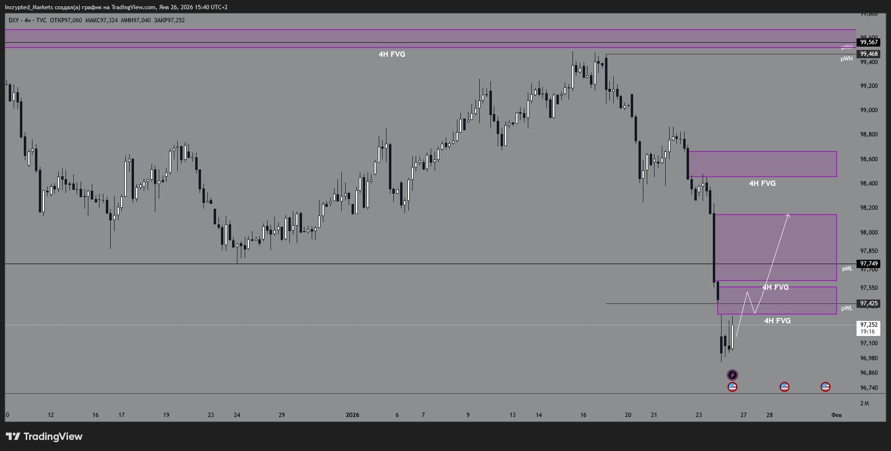 Прошлая неделя отработала как по учебнику: индекс дошел до верхней зоны pWH + 4H FVG (99,49–99,57) и там начал терять импульс. Закрепа сверху не дали — получили сброс и возврат в диапазон. Именно этот отказ сверху и позволил высокорисковым активам немного выдохнуть в конце недели.