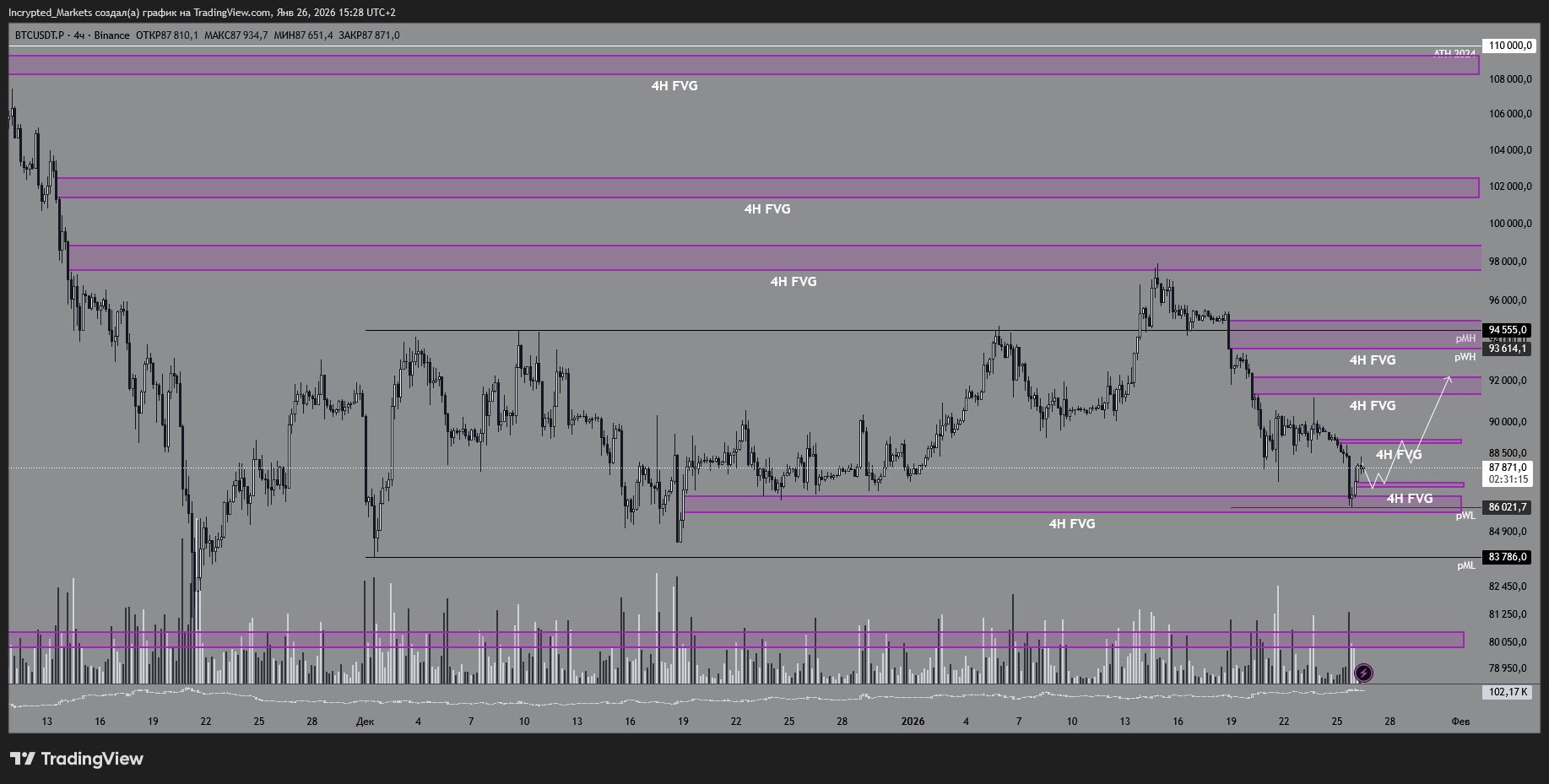 Если двинемся ниже и снимем нижнюю ликвидность, дальше возможен привычный для биткоина паттерн: взяли стопы, показали реакцию покупателя и вернули цену в более безопасные зоны. Здесь ключ в качестве реакции после прокола: если появляется агрессия и удержание, это становится рабочей моделью на возврат к $90 000.