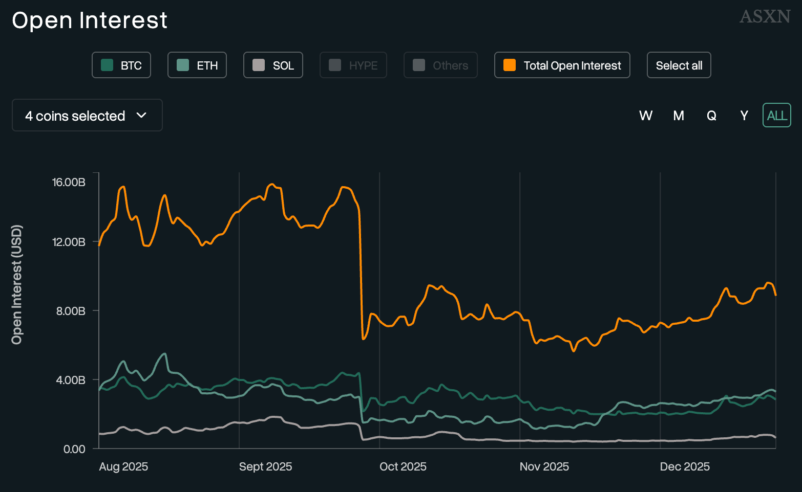 Однако опережающим индикатором выступили бессрочные фьючерсы. Накануне небольшого ралли начала года в секторе наблюдался устойчивый рост открытого интереса (ОИ) при стабильных ставках финансирования. Трейдеры активно наращивали позиции в деривативах, пока спот находился в боковике, что и стало катализатором движения.