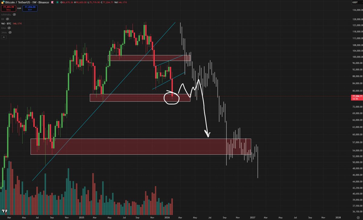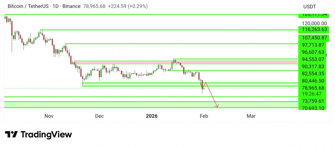 «Если импульс продолжится, то мы можем увидеть биткоин на отметке $73,7 тыс., а затем в области $70–67 тыс. в ближайшие дни», — предупреждает аналитик. Этот сценарий остается актуальным, пока торги проходят ниже уровня $90 тыс.
