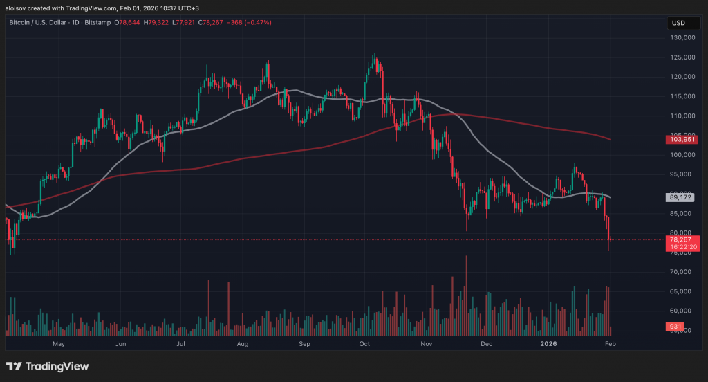 Курс биткоина снизился до $75 555 на бирже Bitstamp, зафиксировав падение на 40% относительно исторического максимума от 6 октября 2025 года. За два дня, с 29 января, первая криптовалюта потеряла 15% стоимости.