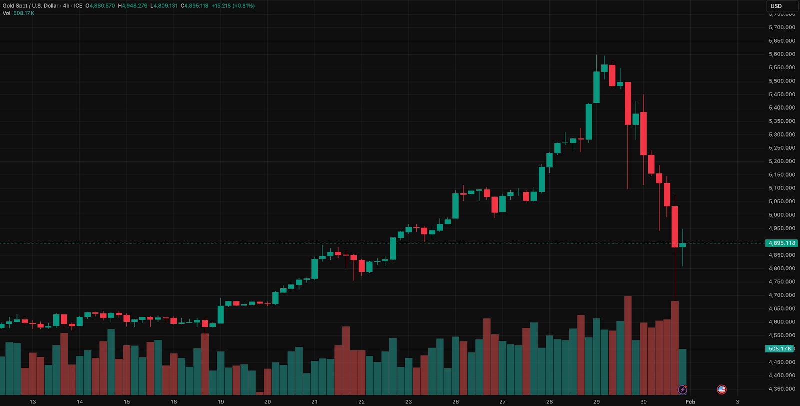 Обвал крипторынка совпал с резкой просадкой драгметаллов. Золото подешевело до ~$4900 за унцию, серебро — до $85. Однако их коррекции предшествовали исторические максимумы, тогда как цифровые активы стагнируют с конца 2025 года.