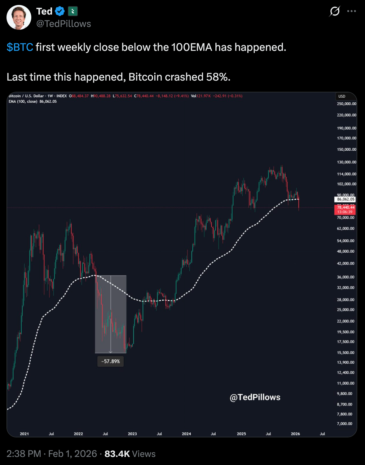 Инвестор Тед Пиллоус обратил внимание на тревожный технический сигнал: недельная свеча впервые закрылась ниже 100 EMA. Прошлый подобный пробой привел к падению котировок на 58%.